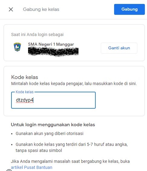 2. Pilih Gabung ke kelas, lalu tampil halaman untuk memasukan kode kelas seperti berikut.