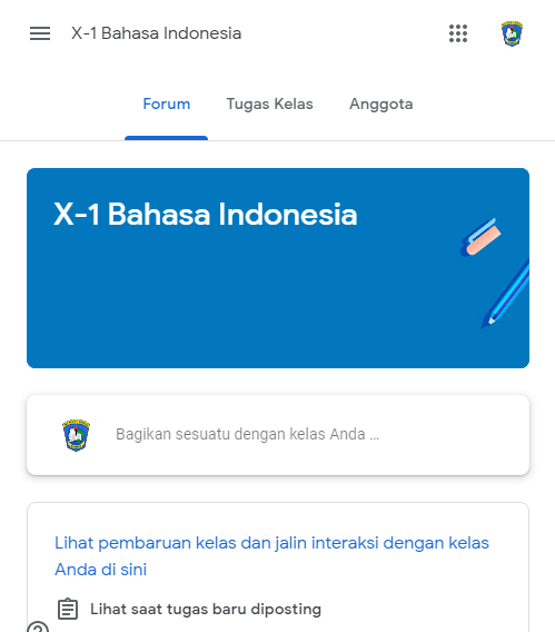 3. Setelah kode kelas dimasukan, pilih tombol Gabung. Lalu tampil halaman beranda kelas seperti gambar berikut.